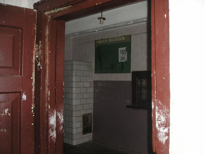 Wnętrze budynku Strabla. Widoczny piec kaflowy, dawny rozkład oraz okienko zlikwidowanej kasy biletowej. Wnętrze brudne i trochę zdewastowane, brak oświetlenia.