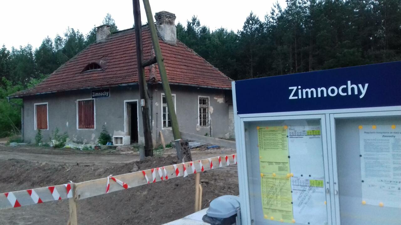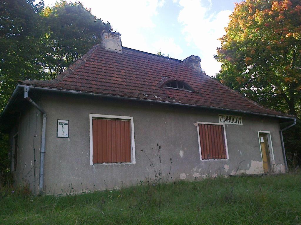Opis ogólny: Budynek jest zdewastowany i zamknięty, otwarta tylko prowizoryczna poczekalnia w przedsionku z jedna ławką. prąd jest światło tez działa. Peron niski drewniany, ogólny wizerunek tragiczny. Peron oświetlony podobnie jak przejazd obok przystanku. Za budynkiem stacyjnym znajdowały się pomieszczenia gospodarcze obecnie zdewastowane i WC również zdewastowane. W budynku była poczekalnia kasa biletowa i pomieszczenia mieszkalne. Peron dość krótki. Obok przystanku zabudowania mieszkalne i droga gruntowa. Stan torów w obrębie przystanku jest katastrofalny. (info: HUMVEEX, 2005-08-30) dodatkowe tory być może były na co wskazuje pozostałość jakby rozjazdu przed samym przystankiem i szeroki nasyp około 55.1 km obok przystanku Zimnochy. (info: KUBAS, 2005-08-31) Opis infrastruktury: Budynek z lat 30-tych XX wieku, obok zabudowania gospodarcze (piwniczka, chlew i inne) a także szalety. Wszystko zarośnięte i rozpadające się ale raczej nie zdewastowane. Peron niski, zbudowany z bala drewnianego, oświetlony. (info: qbass87, 16-09-2013) Opis budynków: Budynek murowany z lat 30-tych XX wieku. Wg posiadanych informacji funkcjonował (poczekalnia) do około I połowy 1999 roku (jednak kasa została w nim zlikwidowana w połowie lat 90-tych). Wyposażony w część mieszkalną, posiada również poddasze. W budynku znajdowała się obszerna poczekalnia z piecem kaflowym, jak i okienko kasowe. Raczej nie posiadał zaplecza sanitarnego (wc znajduje sie około 30 metrów od budynku). W obrębie budynku znajduje sie skrzynka telefonu kolejowego. Bardzo klimatyczne miejsce. (info: qbass87, 16-09-2013) |