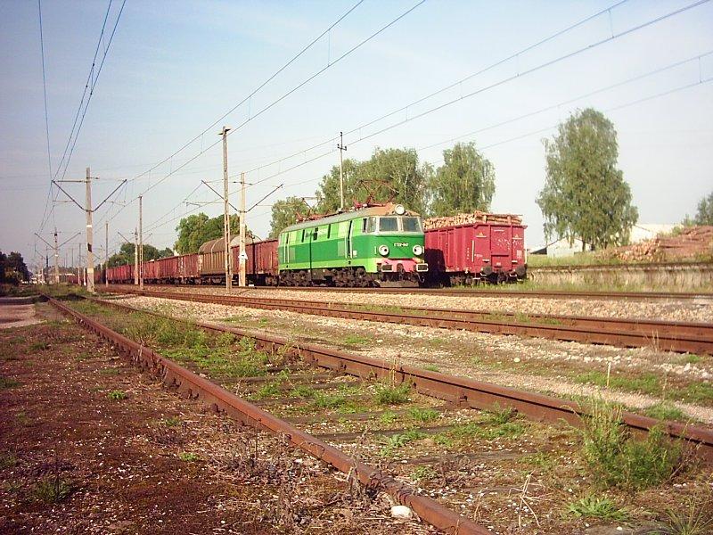 ET22 o nieznanym numerze hamuje przed semaforem wjazdowym, by zaraz minąć się z pociągiem pasażerskim. Widok od strony wjazdu z Białegostoku.