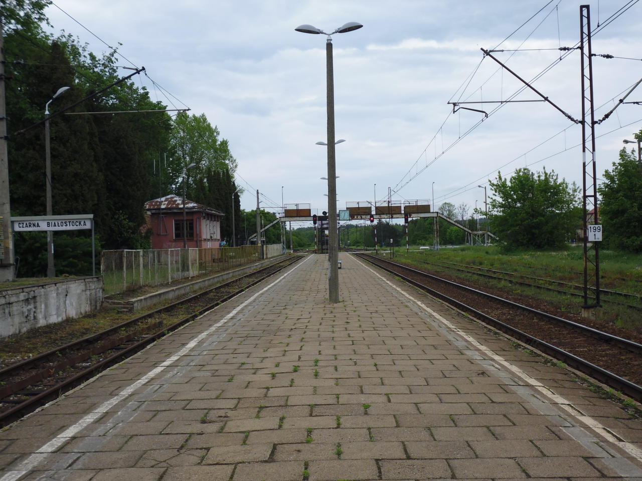 Stacja kolejowa w Czarnej Białostockiej. Peron 2, z lewej budynek dworca z nastawnią dysponującą. W tle kładka dla pieszych. Widok w kierunku Sokółki.