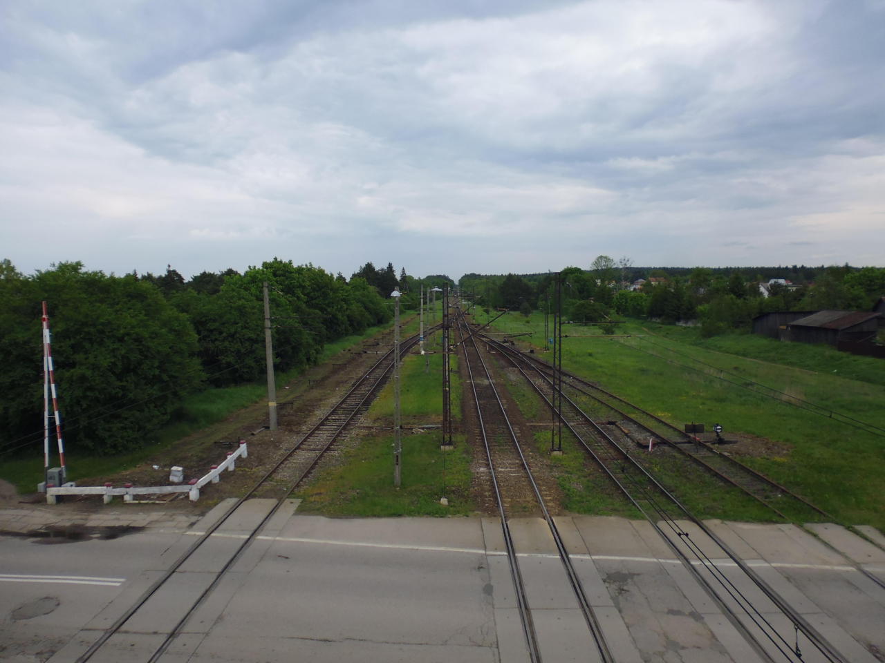Przejazd kolejowy przez ul. Marszałka Józefa Piłsudskiego i głowica stacji w stronę Sokółki. Widok z kładki nad torami.