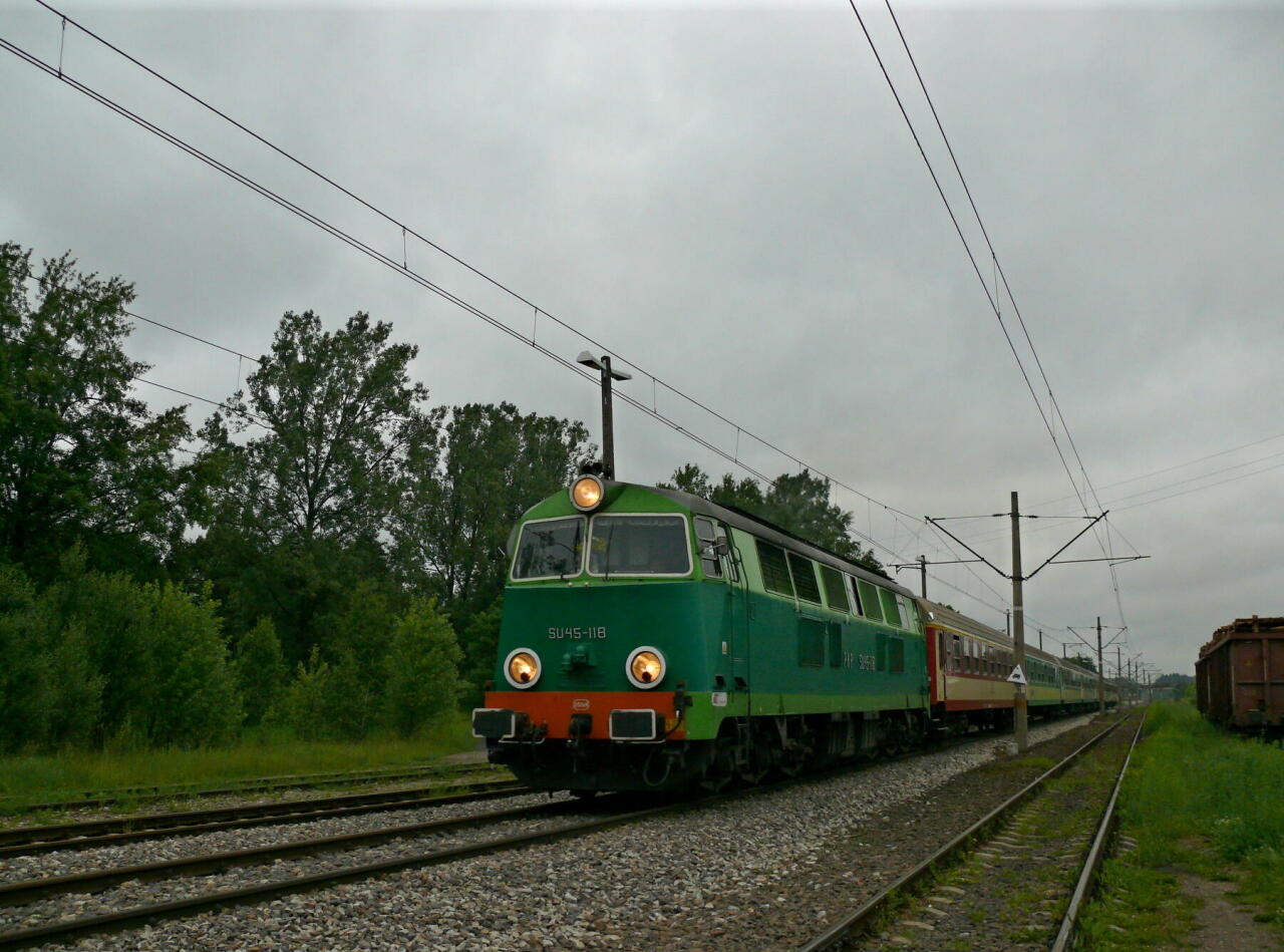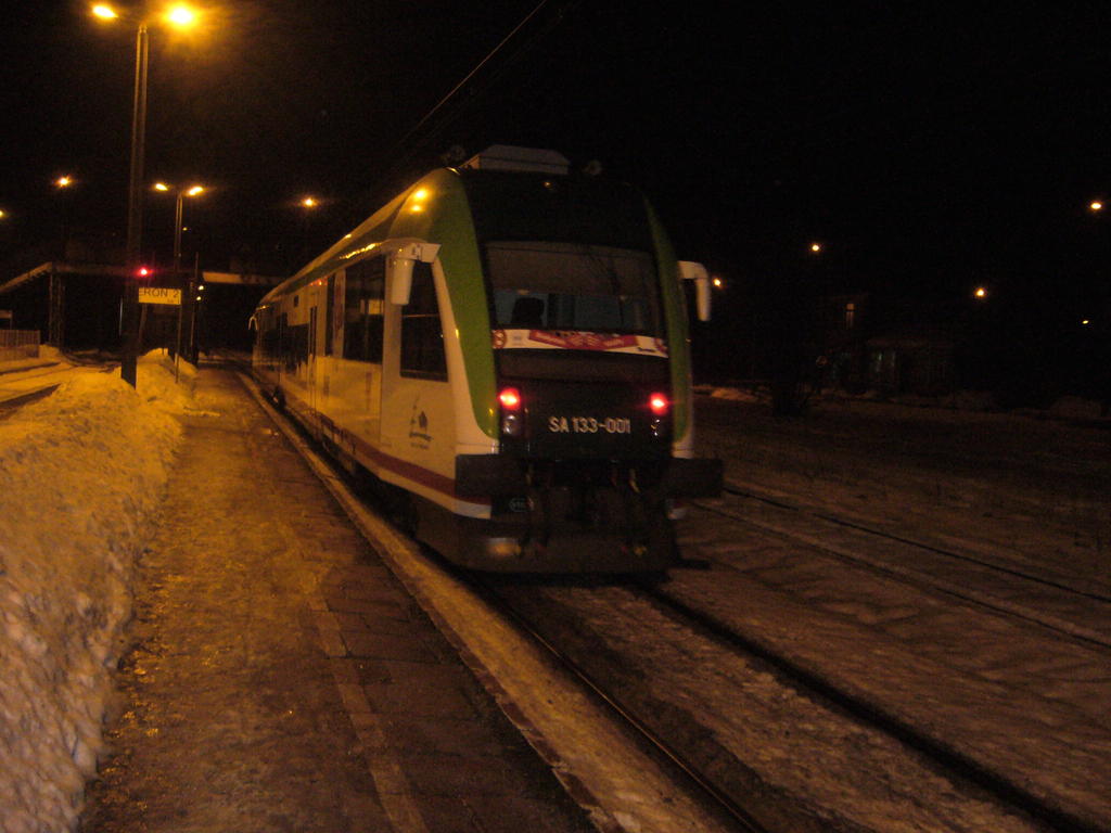 SA 133 001 jako poc R rel Białystok- Suwałki opuszcza stacje. Widok od strony Białegostoku.