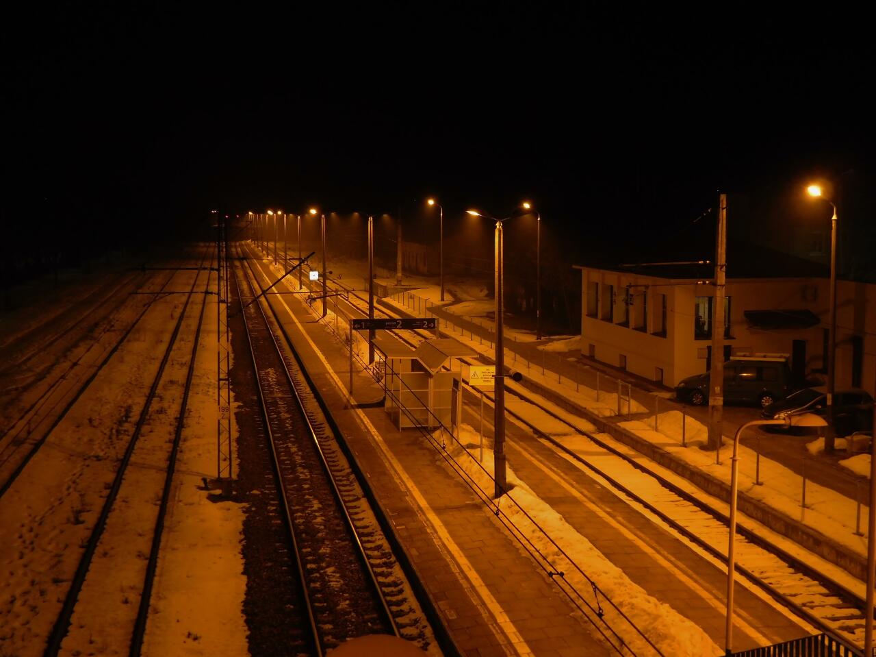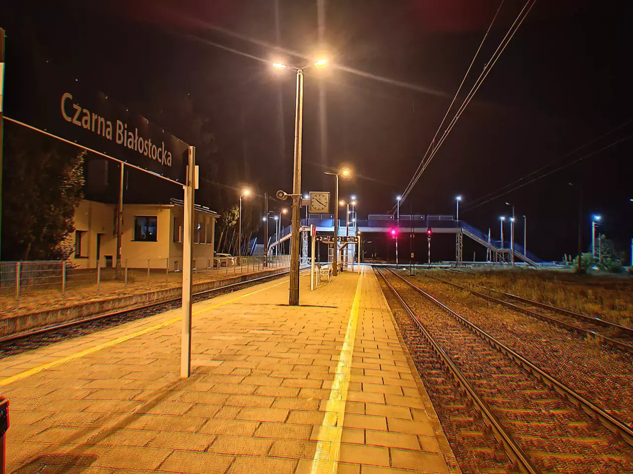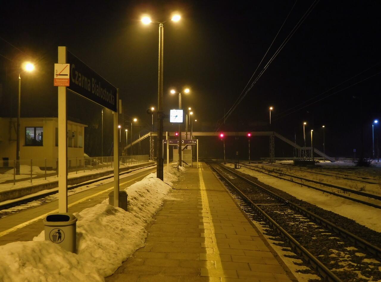 Stacja nocną porą. Peron 2. Z prawej budynek dworca nastawnią dysponującą. Widok z kładki nadziemnej dla pieszych w kierunku Białegostoku.