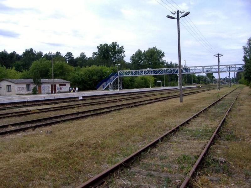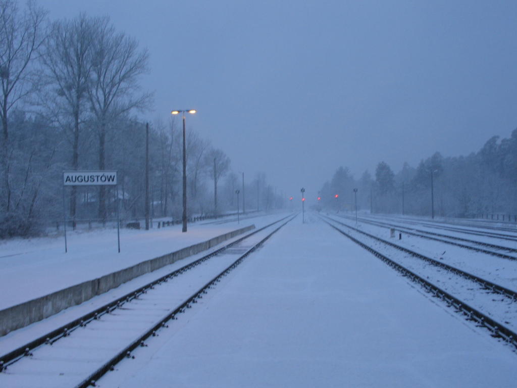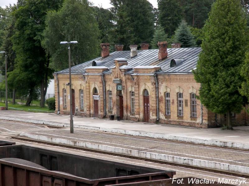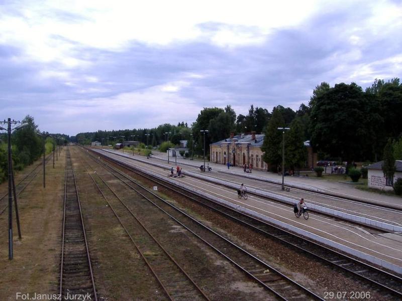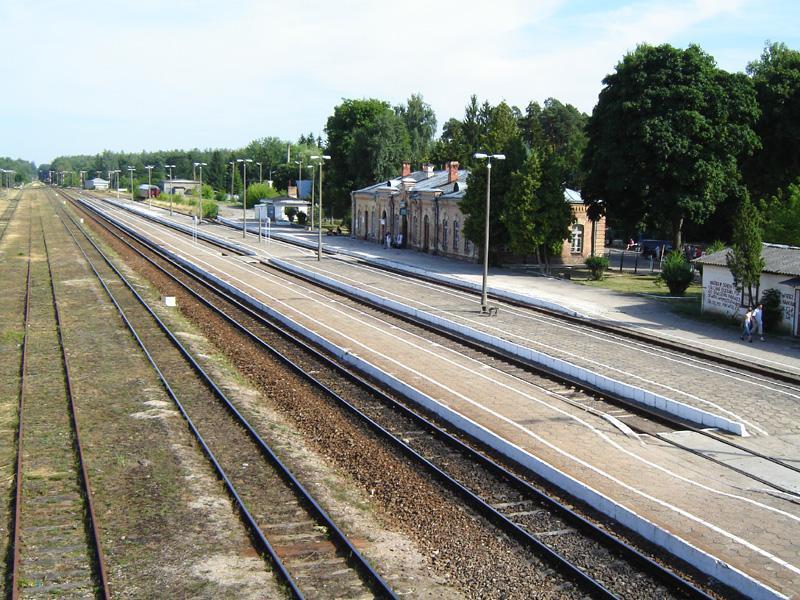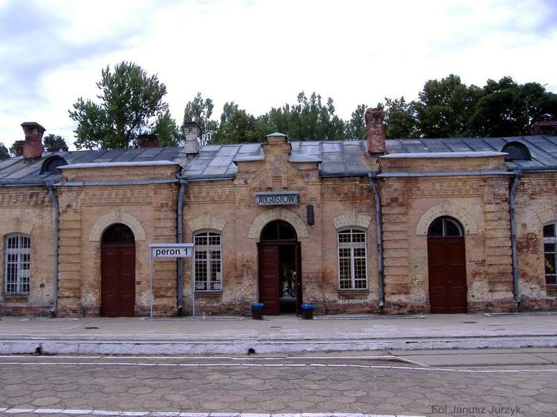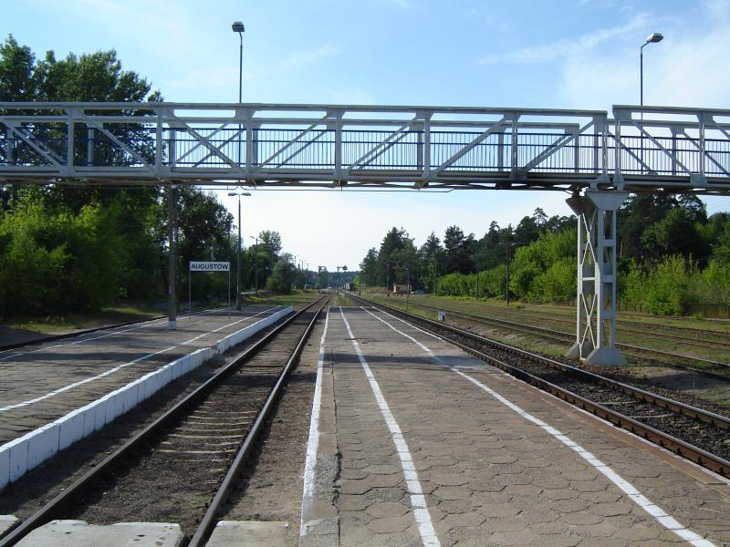 Augustów, widok na perony i budynek dworca od strony wjazdu z Suwałk.