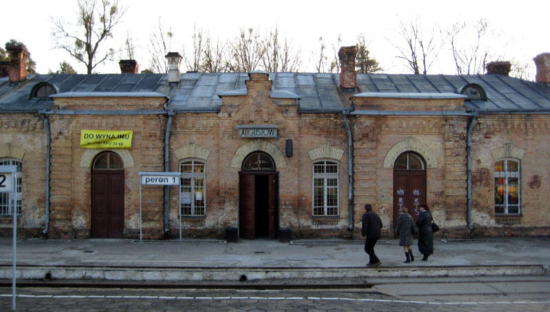Stacja PKP Augustów. Część budynku dworcowego jest do wynajęcia. Widok od strony peronów: w lewo Sokółka, w prawo Suwałki.