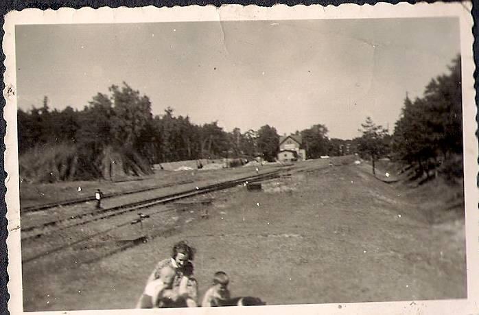 Stacja Ostromecko w 1958-mym roku. Widok ogólny stacji. Po lewej, na składnicy, wiklina, tzw. faszyna, używana do wzmacniania rowów melioracyjnych. Dalej sztaple z tzw. kopalniakami, używanymi do wzmacniania chodników w kopalniach węgla. Stacja była otoczona wysokimi lasem sosnowym i kasztanami. Na zdjęciu widoczny IV-ty tor, już zlikwidowany i semafory.
