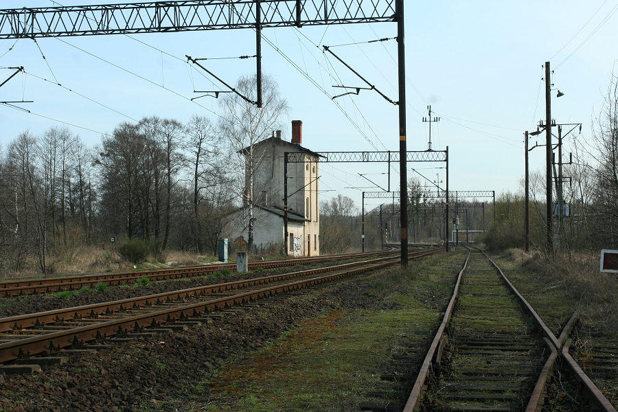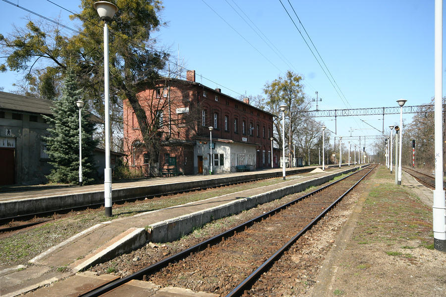 Widok na perony i budynek dworca z przybudówką nastawni od strony wjazdu z Grabowna Wielkiego/Oleśnicy. Kierunek północno-zachodni.
