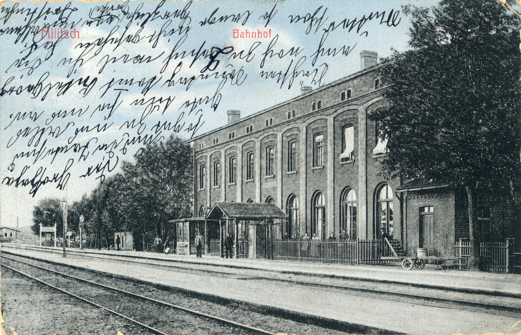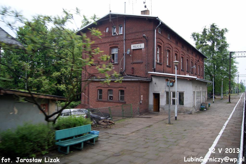 Stacja Milicz - budynek stacyjny, w lewo - kierunek Grabowno Wielkie (Oleśnica), w prawo - kierunek Krotoszyn (Chojnice).