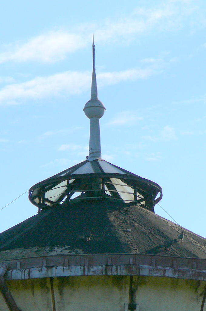 Milicz. Szczyt wieży wodnej z ozdobnym szpicem.