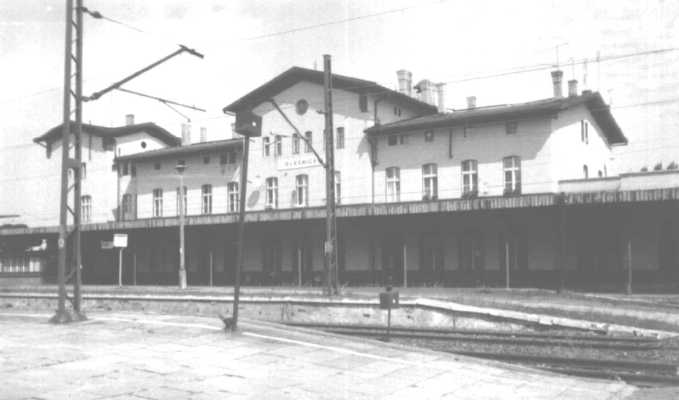 Dworzec kolejowy w Oleśnicy - widok od strony zachodniej i dojazdu od miasta ul. Kolejową. Z lewej strony północna grupa (towarowa), z prawej strony południowa grupa torów (pasażerska).