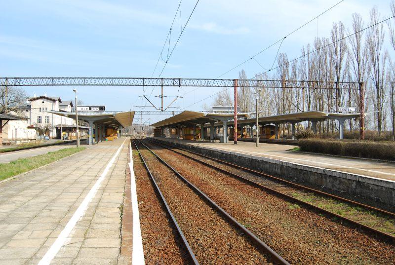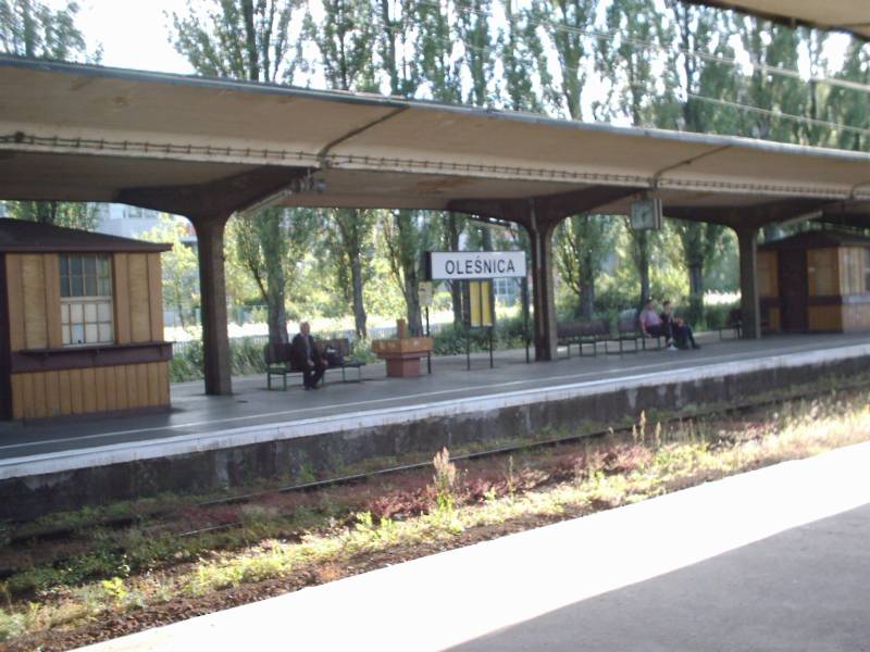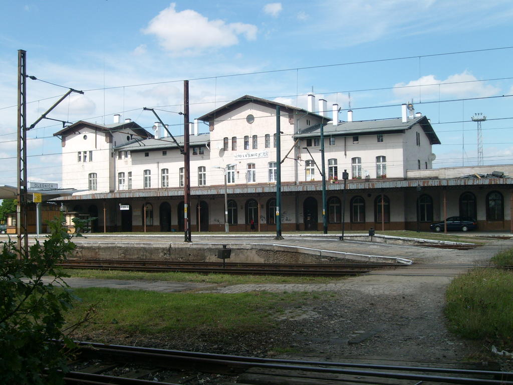 Stacja Oleśnica - południowa, pasażerska część stacji. Widok na perony i budynek stacyjny od strony zachodniej - wjazdy z Wrocławia i Grabowna Wielkiego (dalej Krotoszyn i Ostrów Wielkopolski).