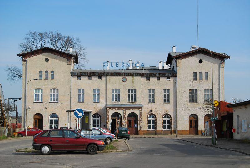 Stacja Oleśnica - budynek stacyjny widoczny od strony zachodniej (wjazd z miasta ulicą Kolejową).