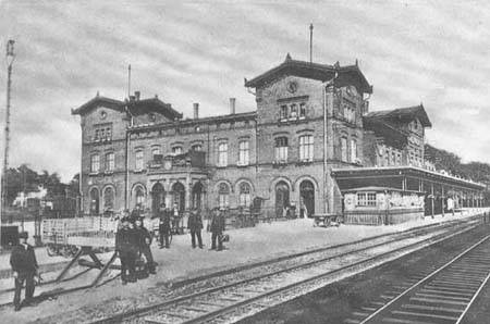 Dworzec w Oleśnicy w 1903 roku przed budową peronów wyspowych. Widok od strony południowo-zachodniej (wjazdy z Wrocławia i Grabowna Wielkiego).