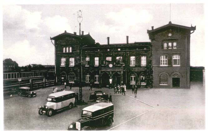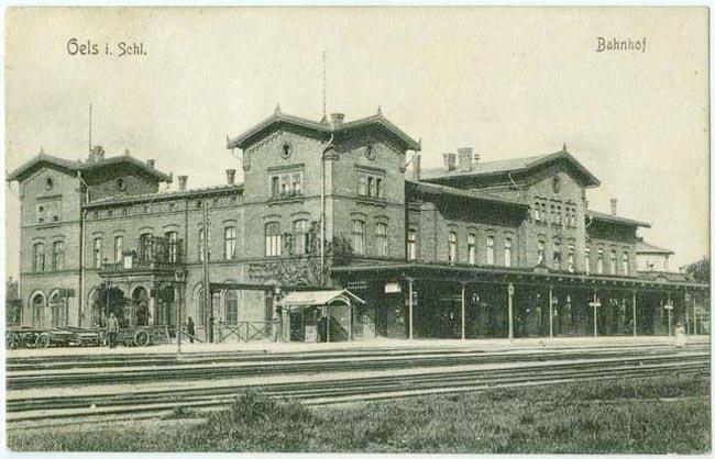 Dworzec w Oleśnicy na starej pocztówce przed budową peronów wyspowych. Widok od strony południowo-zachodniej (wjazdy z Wrocławia i Grabowna Wielkiego).