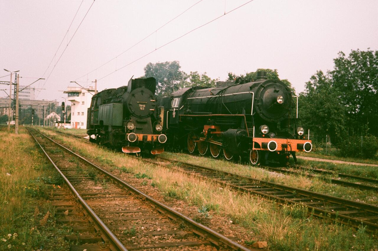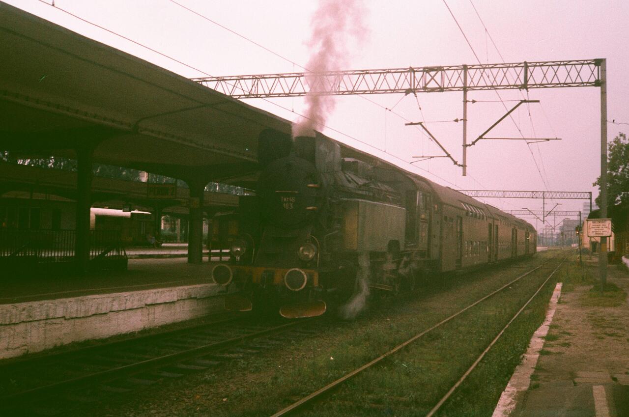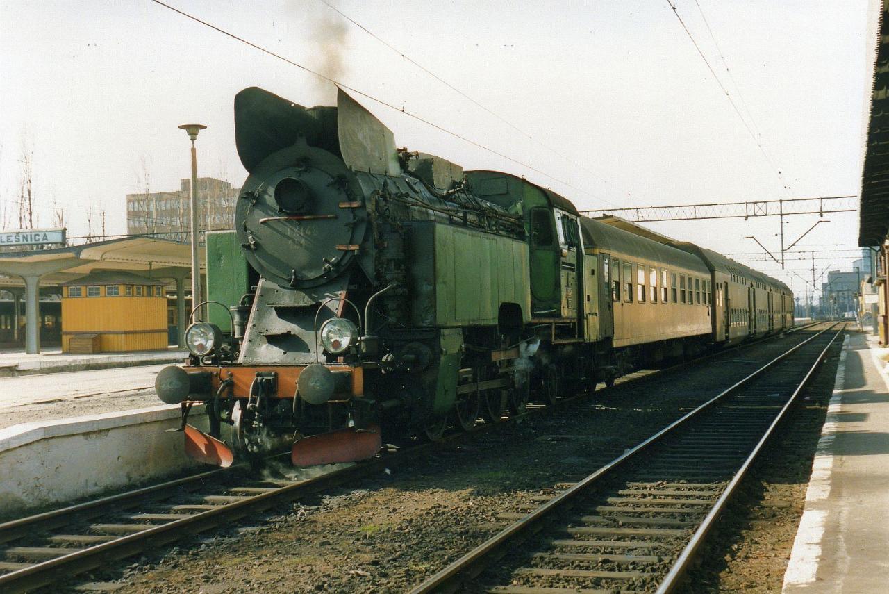 Stacja Oleśnica - parowóz Tkt48-183 (MD Ostrów Wielkopolski, do 30.04.1990 r. MD Kępno) podczas oblotu składu oraz pomnik Tr202-28. Na dalszym planie budynek nastawni dysponującej "Ol". Widok w kierunku zachodnim: Wrocław, Grabowno Wielkie (dalej Krotoszyn i Ostrów Wielkopolski).
