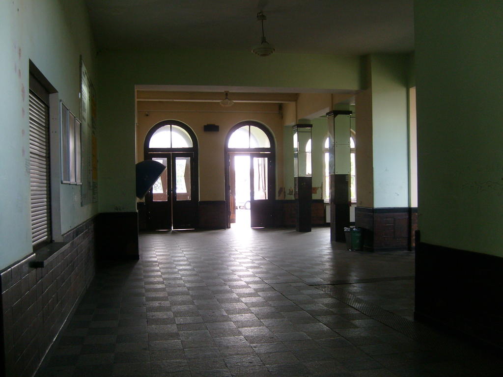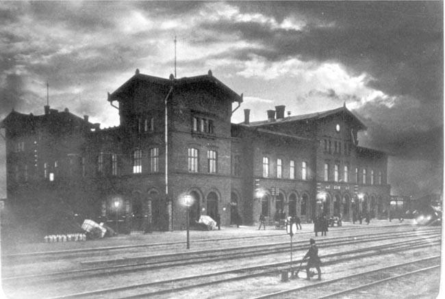 Budynek dworca od strony podjazdu. Z lewej strony północna grupa (towarowa), z prawej strony południowa grupa torów (pasażerska). Widok w kierunku wschodnim.
