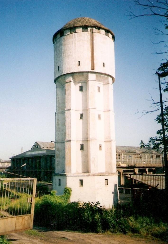 Oleśnica - wieża wodna na terenie Zakładów Naprawczych Taboru Kolejowego w 1999 r. Na drugim planie widoczne zabudowania zakładów. Widok z wiaduktu drogowego na ul. Moniuszki.