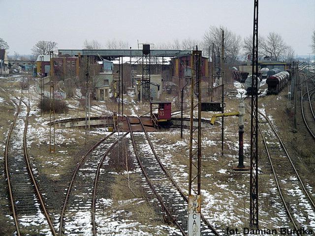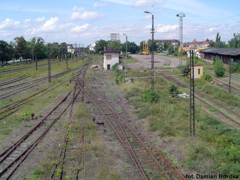 Zdjęcie z kładki dla pasażerów, tym razem ukazujące zachodnią część grupy towarowej. Po prawej stronie place ładunkowe wraz z dawnymi magazynami, wagą oraz skrajnikiem. Tor przebiegający przez środek zdjęcia jest zelektryfikowany i stanowi dojazd do ZNTK. Na drugim planie widoczna jedna z nieczynnych nastawni wykonawczych. Widok w kierunku zachodnim - wyjazdy na Wrocław i Grabowno Wielkie (dalej Krotoszyn i Ostrów Wielkopolski).