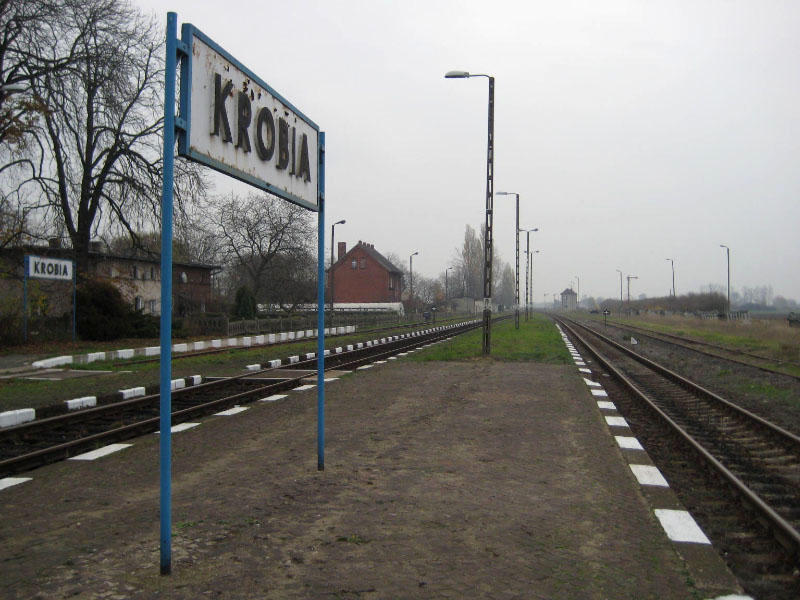 Krobia. Nastawnia Kr1; w lewo wyjazd w kierunku Kobylina/Krotoszyna i Miejskiej Górki, w prawo perony. Kierunek południowy.