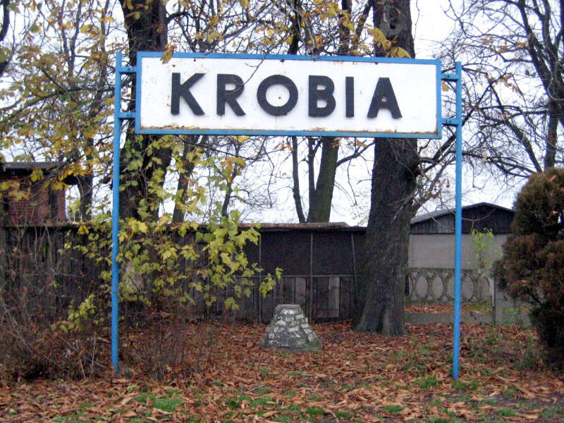 Stacja PKP Krobia. Tablica z nazwą stacji na peronie 1.