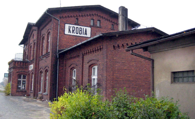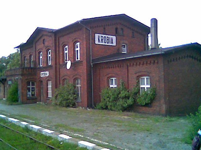 Stacja PKP Krobia. Budynek dworcowy. Widok od strony miasta, w kierunku południowa.