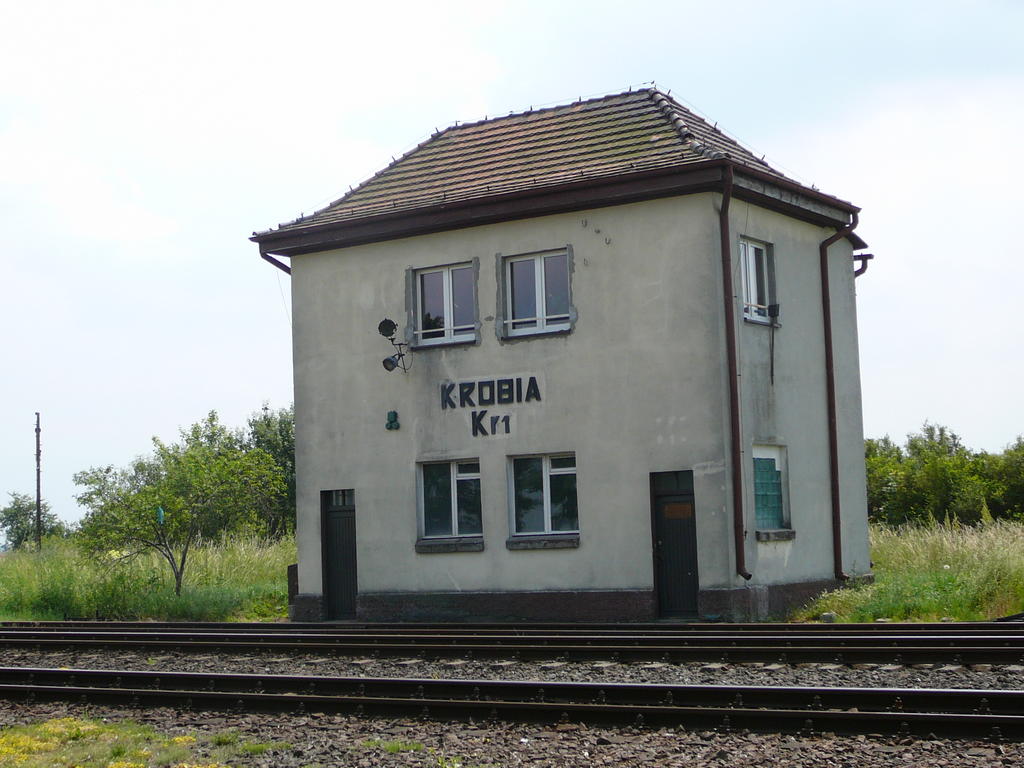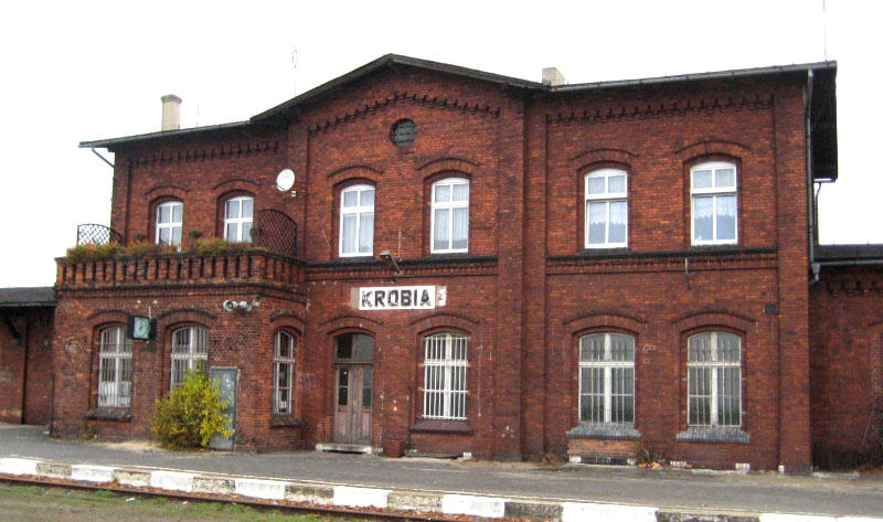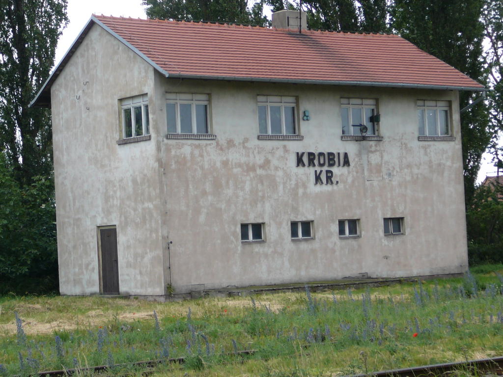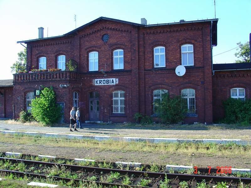Stacja PKP Krobia. Budynek dworca z przybudówką nastawni od strony peronów. Widok w kierunku północnym: w lewo Leszno/Kąkolewo i Gostyń, w prawo Kobylin/Ostrów Wielkopolski i Miejska Górka.