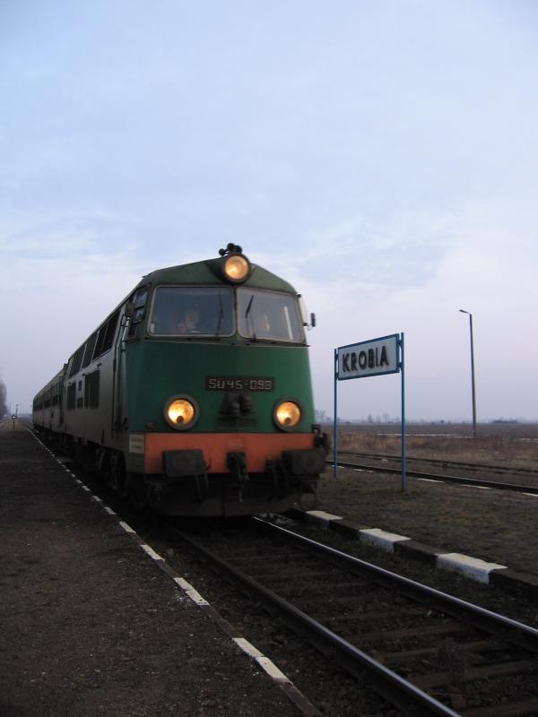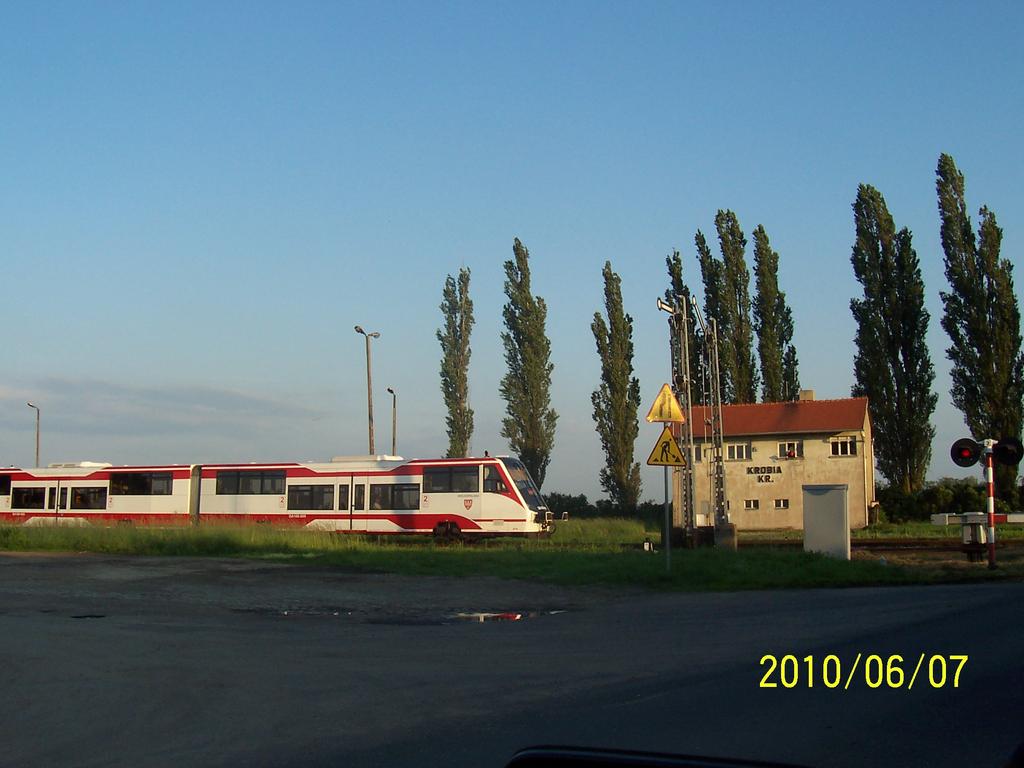 Pociąg osobowy z Krotoszyna do Leszna wjeżdża na stację Krobia. Widok w kierunku Kobylina/Krotoszyna i Miejskiej Górki (wschód).
