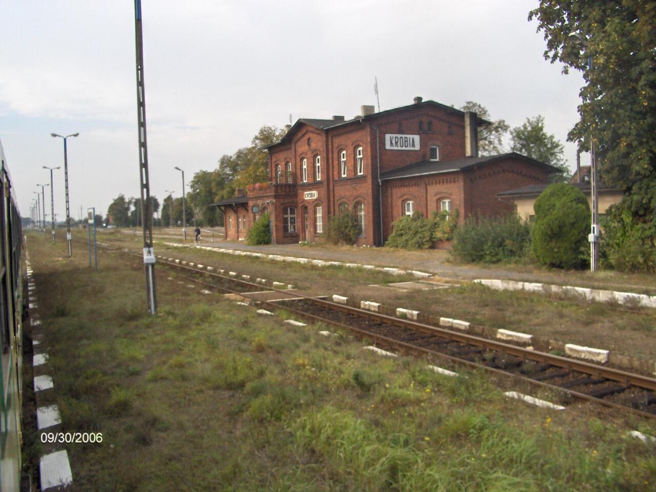 Krobia. Budynek dworca z przybudówką nastawni od strony peronów; w lewo Leszno/Kąkolewo i Gostyń, w prawo Kobylin/Ostrów Wielkopolski i Miejska Górka. Kierunek północny.
