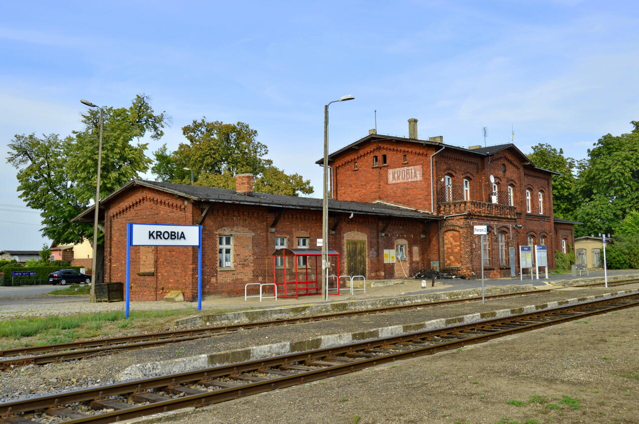 Peron 1 stacji Krobia. Po prawej budynek dworca PKP, po lewej pociąg retro Marcin relacji Wolsztyn – Krobia – Leszno – Poznań Główny organizowany przez IRiPK TurKol.pl. Widok w kierunku zachodnim (Kąkolewo/Leszno, Gostyń).