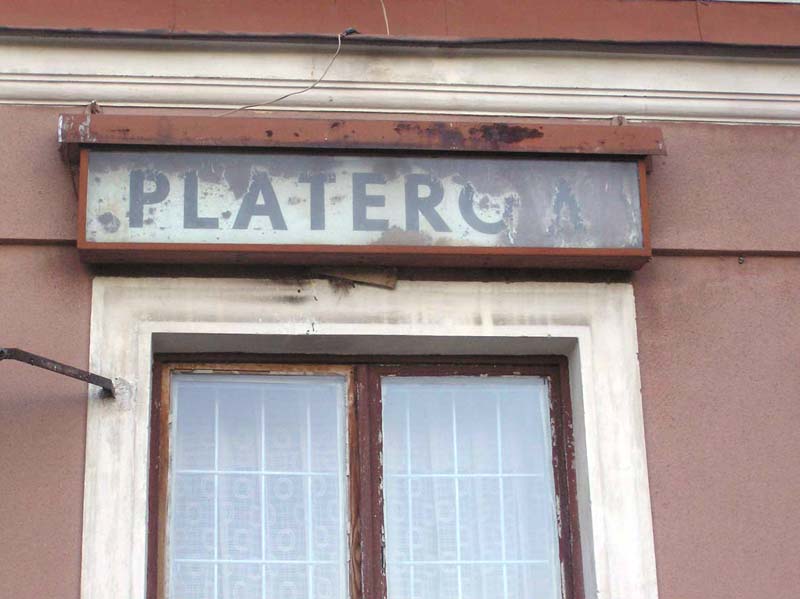 Platerów. Tablica z nazwą stacji od strony peronu.