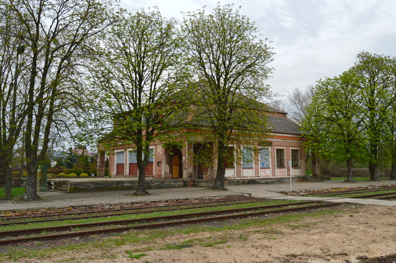 Widok od strony torowiska na nieczynny i powoli rozpadający się budynek dworca.