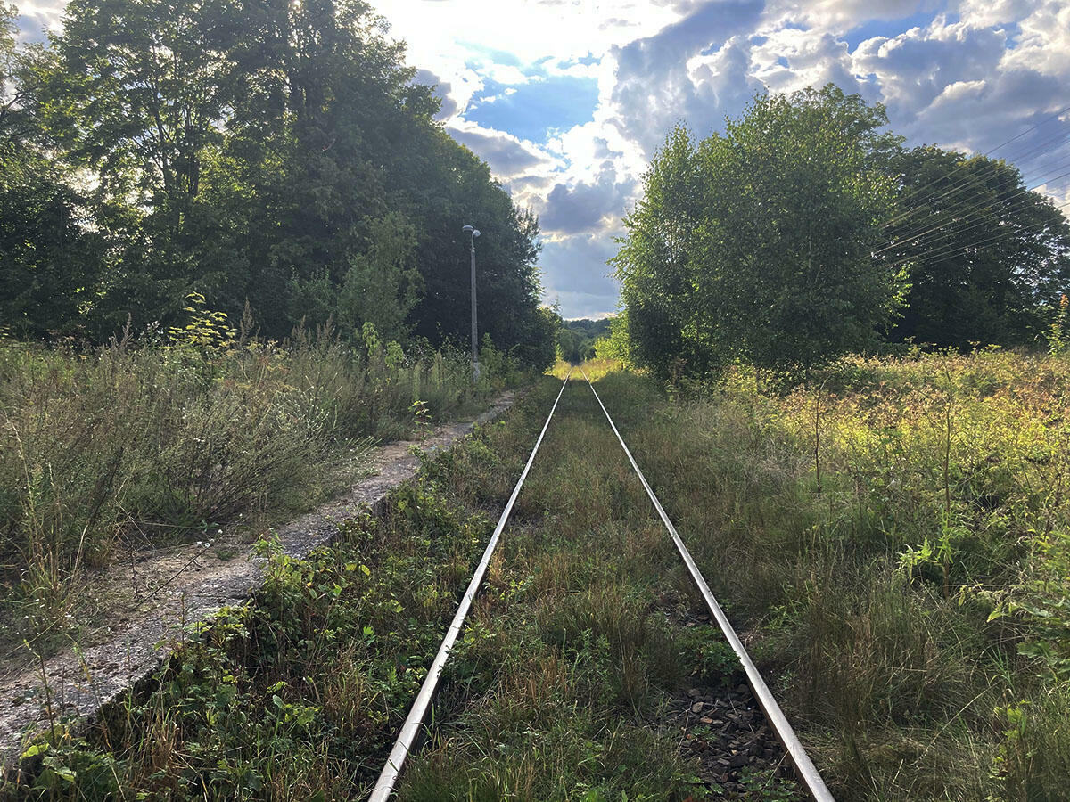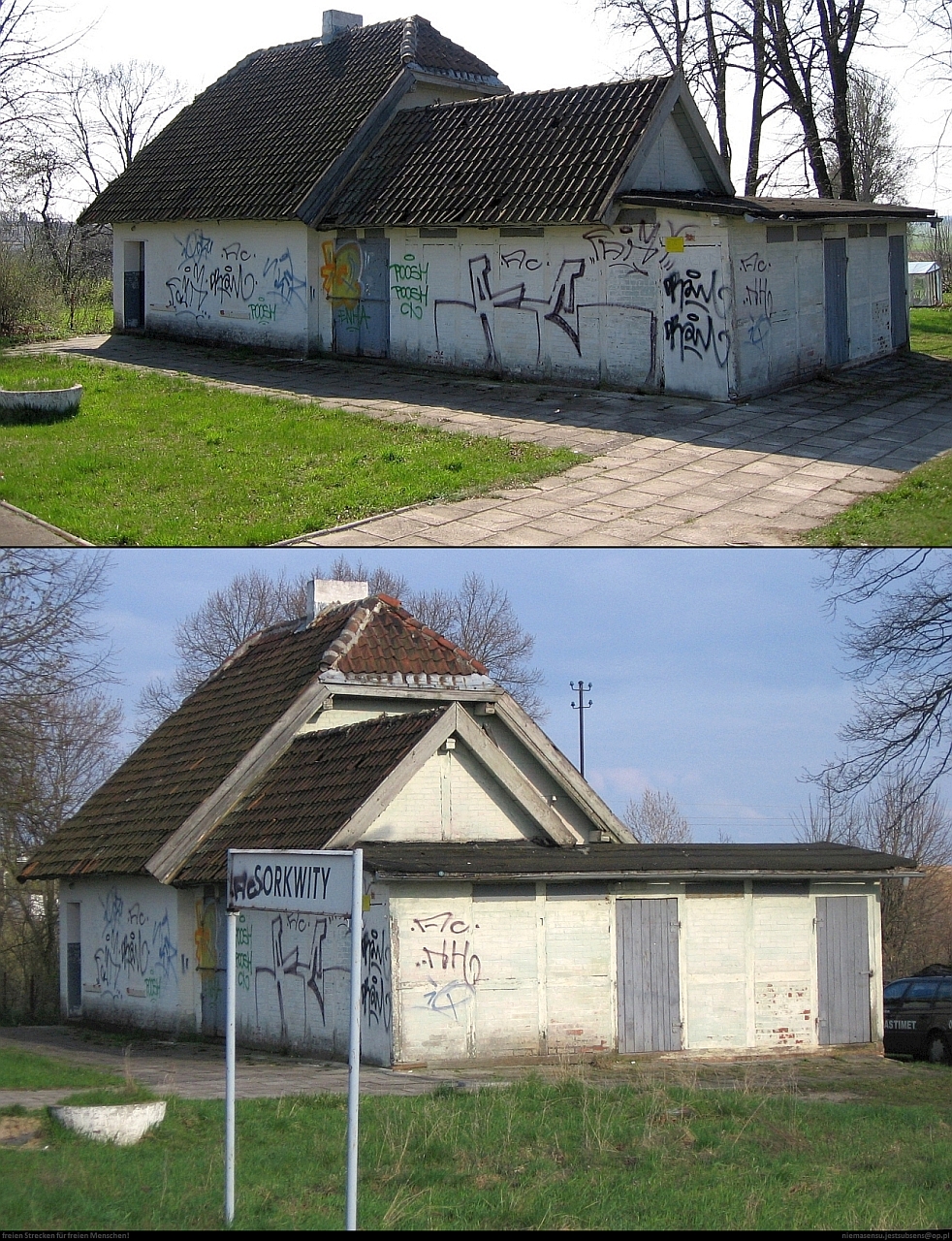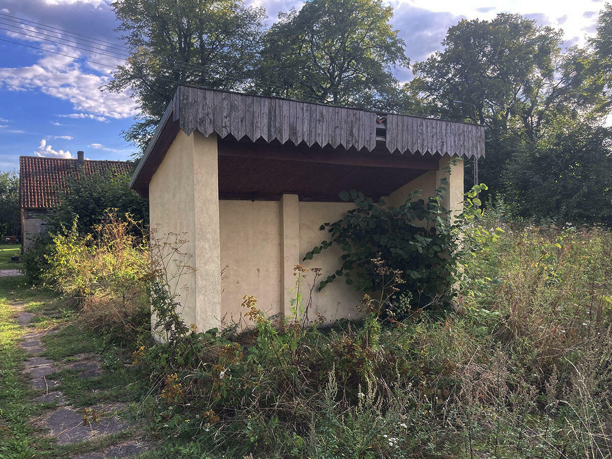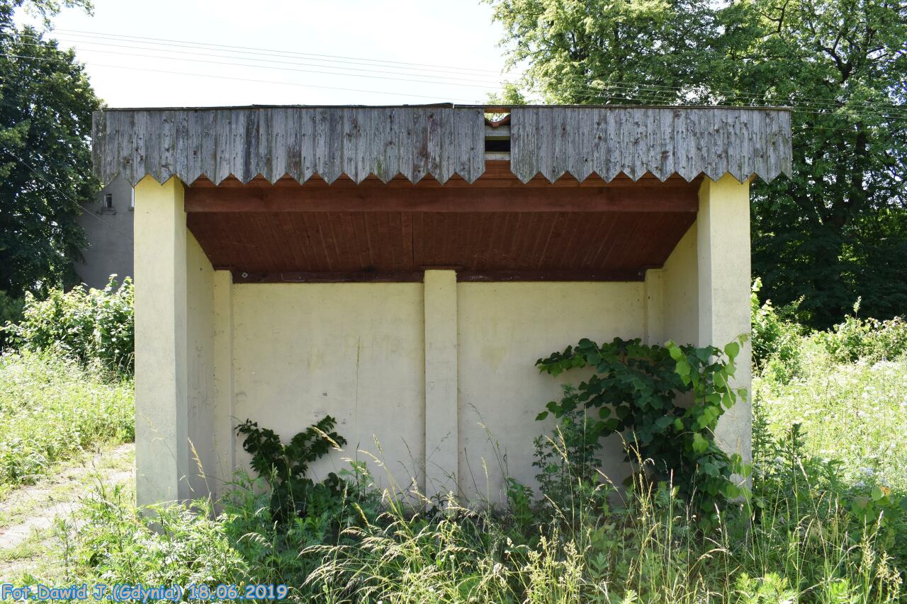 Zarośnięta wiata na stacji Sorkwity.