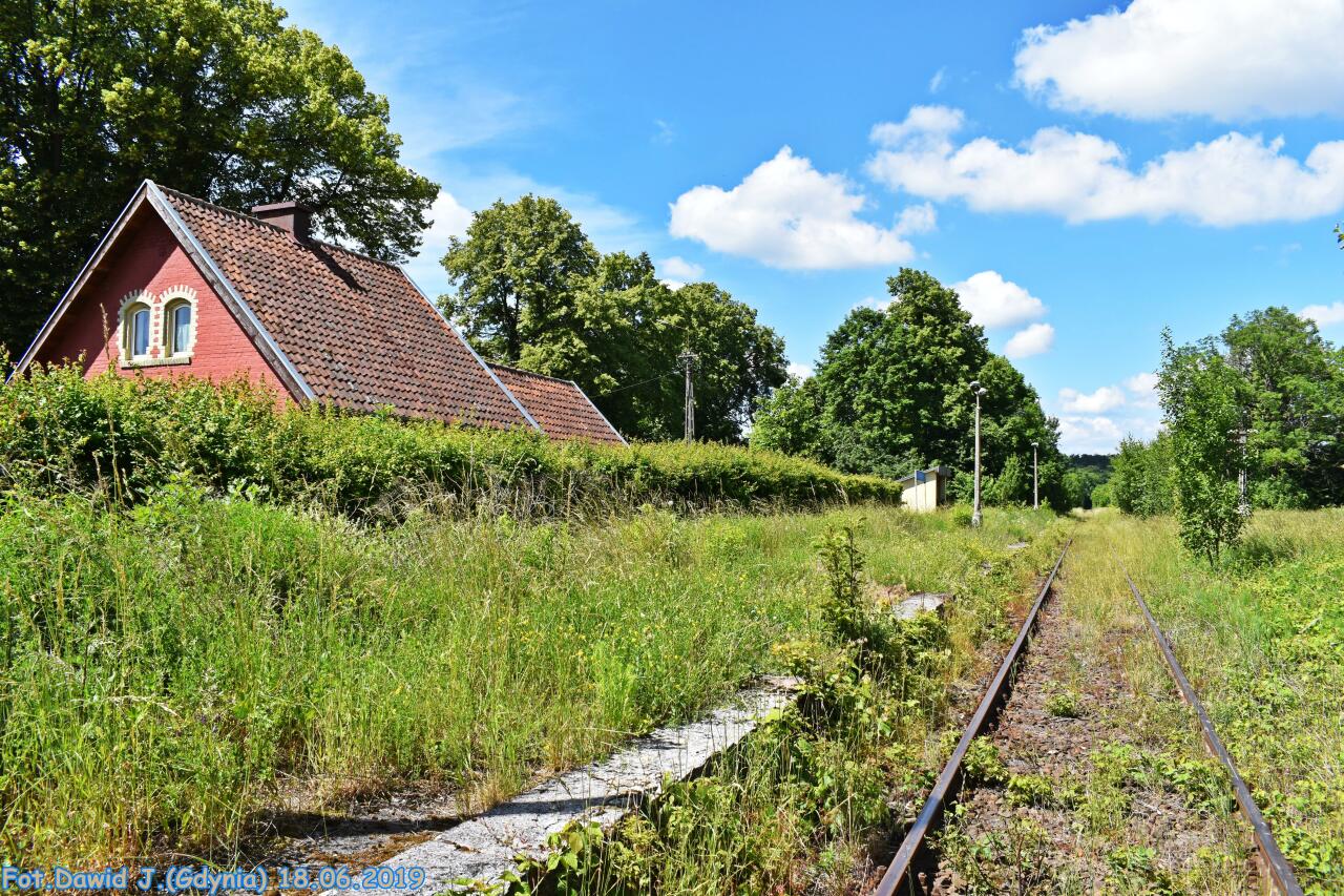 Budynek dworcowy widoczny od strony podjazdu. Kiedyś z przyległą częścią z WC, obecnie pełni funkcję mieszkaniową. Widok w kierunku Mrągowa, Ełku.