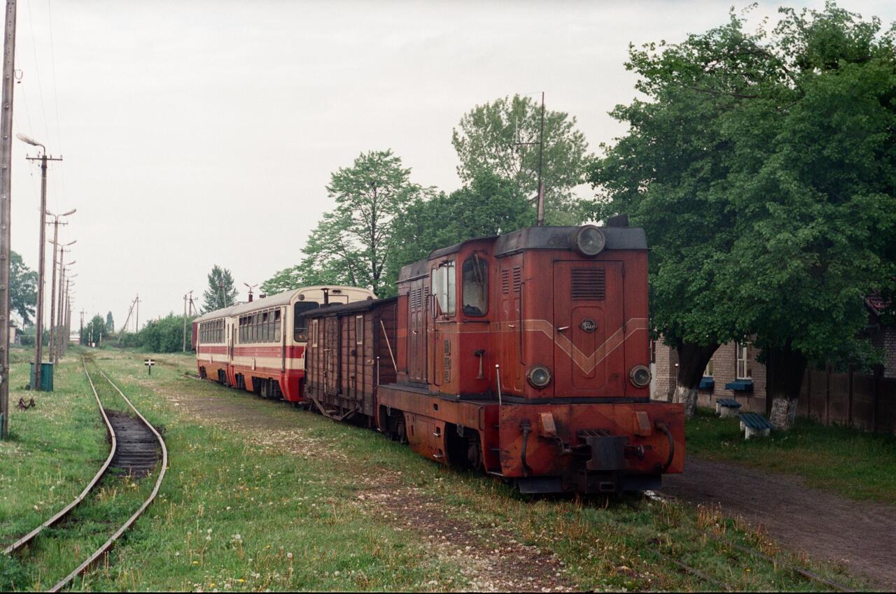 Stacja Rawa Mazowiecka - pociąg TOS 1762 relacji Biała Rawska - Rawa Mazowiecka, prowadzony lokomotywą Lxd2-264 skończył bieg. Z lewej strony widoczny plac ładunkowy oraz napęd przeciągarki linowej odcinka toru normalnego. W początkach lat siedemdziesiątych ubiegłego wieku wobec niedostatecznej ilości wagonów transporterów wybudowano na stacji Rawa Mazowiecka zapadnię transporterową i fragment toru normalnotorowego złożony z połączonych rozjazdem dwóch odcinków o długości 200 metrów. Umożliwiało to wyładowanie wagonów normalnotorowych z wagonów transporterów. Na czas wyładunku lub załadunku wagonów normalnotorowych transportery te mogły być użyte do przewozu innych wagonów normalnotorowych. W lewo - kierunek Biała Rawska, w prawo - kierunek Rogów Osobowy Wąskotorowy.
