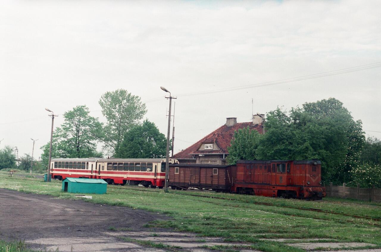 Stacja Rawa Mazowiecka - magazyn przesyłek bagażowych i ekspresowych, budynek stacyjny, pociąg TOS 1755 relacji Rogów Osobowy Wąskotorowy - Biała Rawska, prowadzony lokomotywą Lxd2-265, z prawej skład od pociągu TOS 1756 relacji Biała Rawska - Rawa Mazowiecka. Widok w kierunku stacji Rogów Osobowy Wąskotorowy.