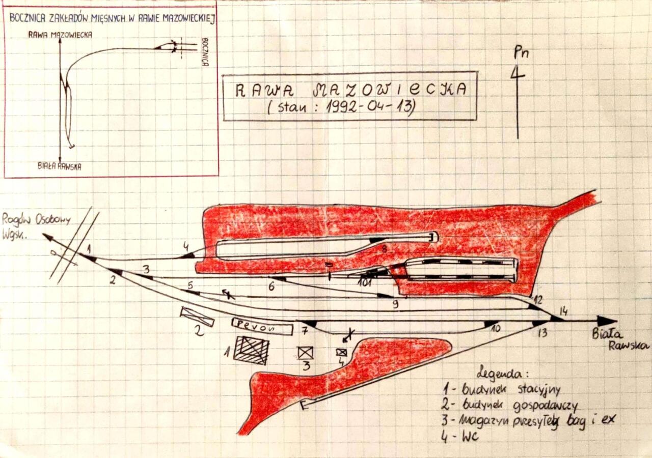 Rawa Mazowiecka - uproszczony schemat stacji. Stan na dzień 13 kwietnia 1992 roku.