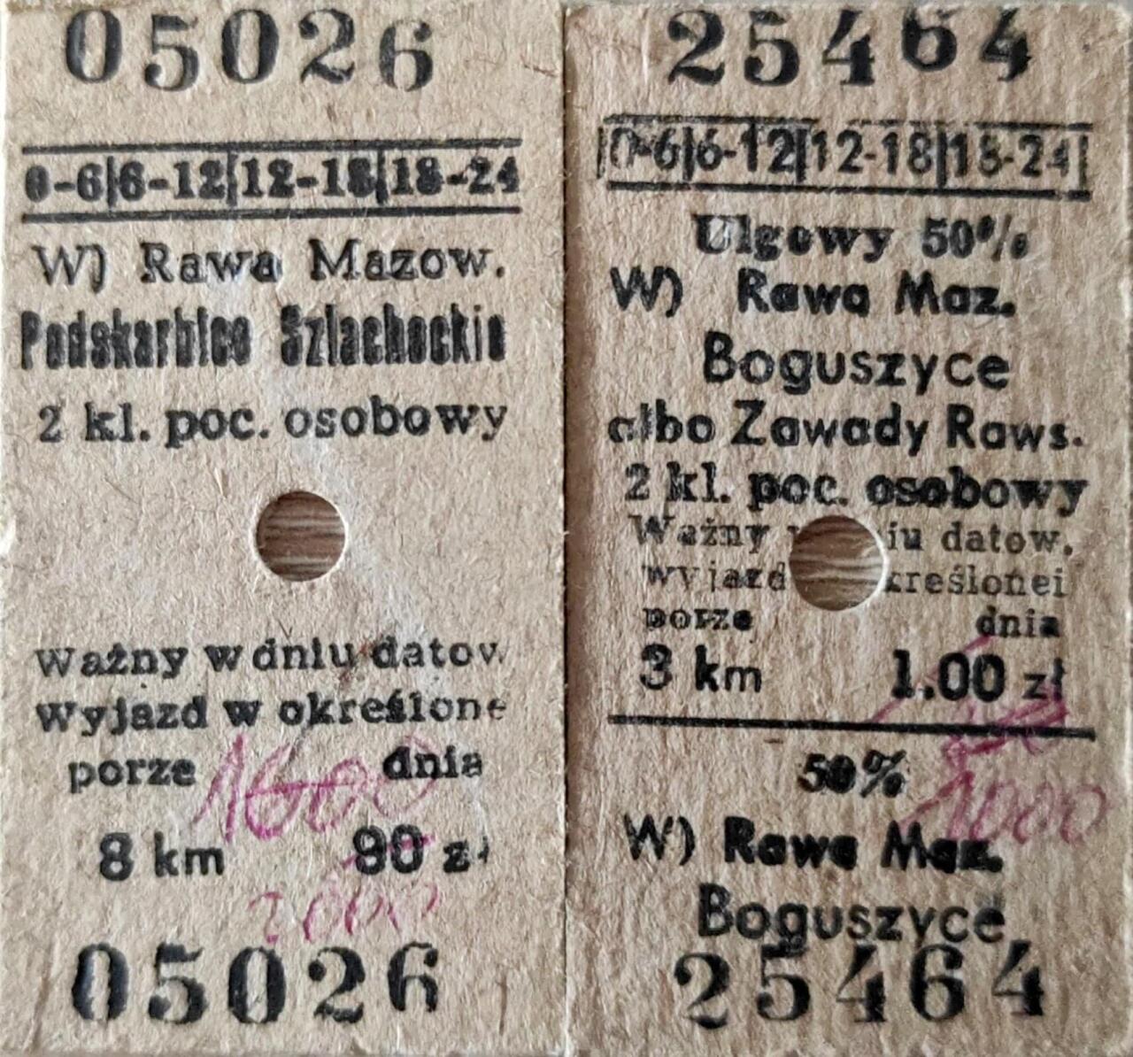 Bilety kartonowe wydane w kasie biletowej stacji Rawa Mazowiecka w dniu 13 kwietnia 1992 roku.