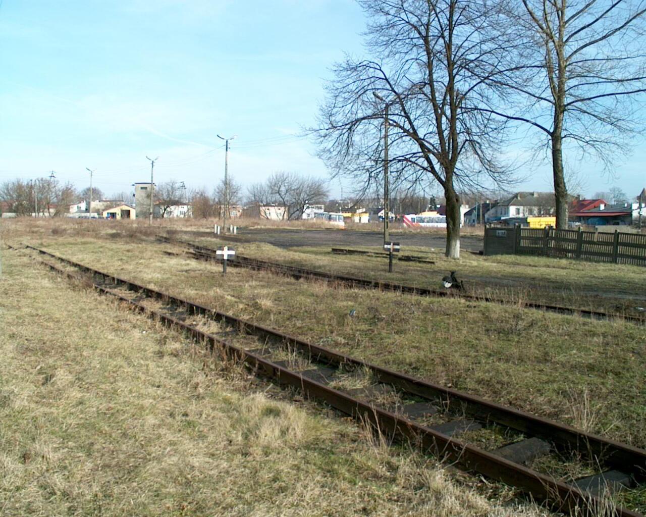 Stacja Rawa Mazowiecka - plac ładunkowy, z prawej budynek stacyjny. Widok w kierunku stacji Rogów Osobowy Wąskotorowy (tor na prawo od budynku stacyjnego).