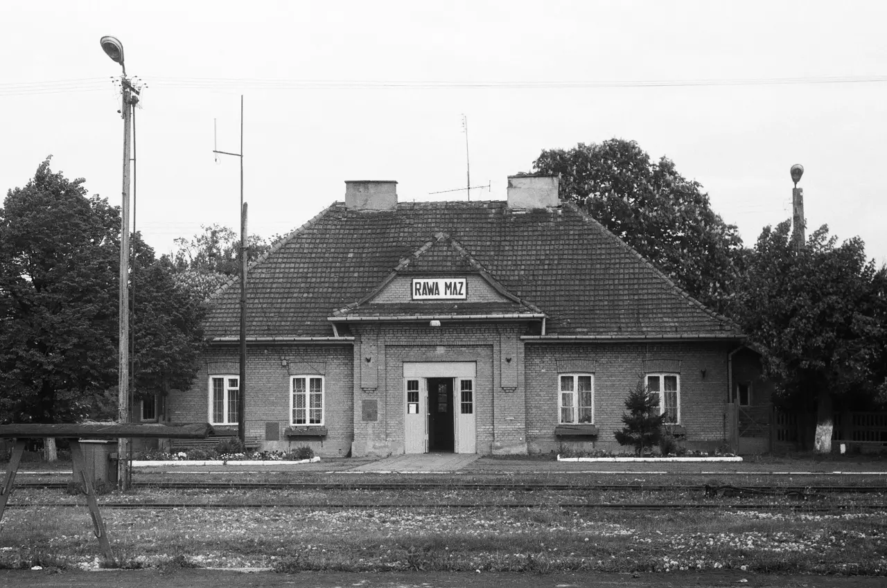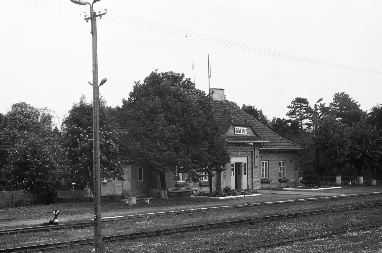 Stacja Rawa Mazowiecka - budynek stacyjny, w lewo - kierunek Biała Rawska, w prawo - kierunek Rogów Osobowy Wąskotorowy.