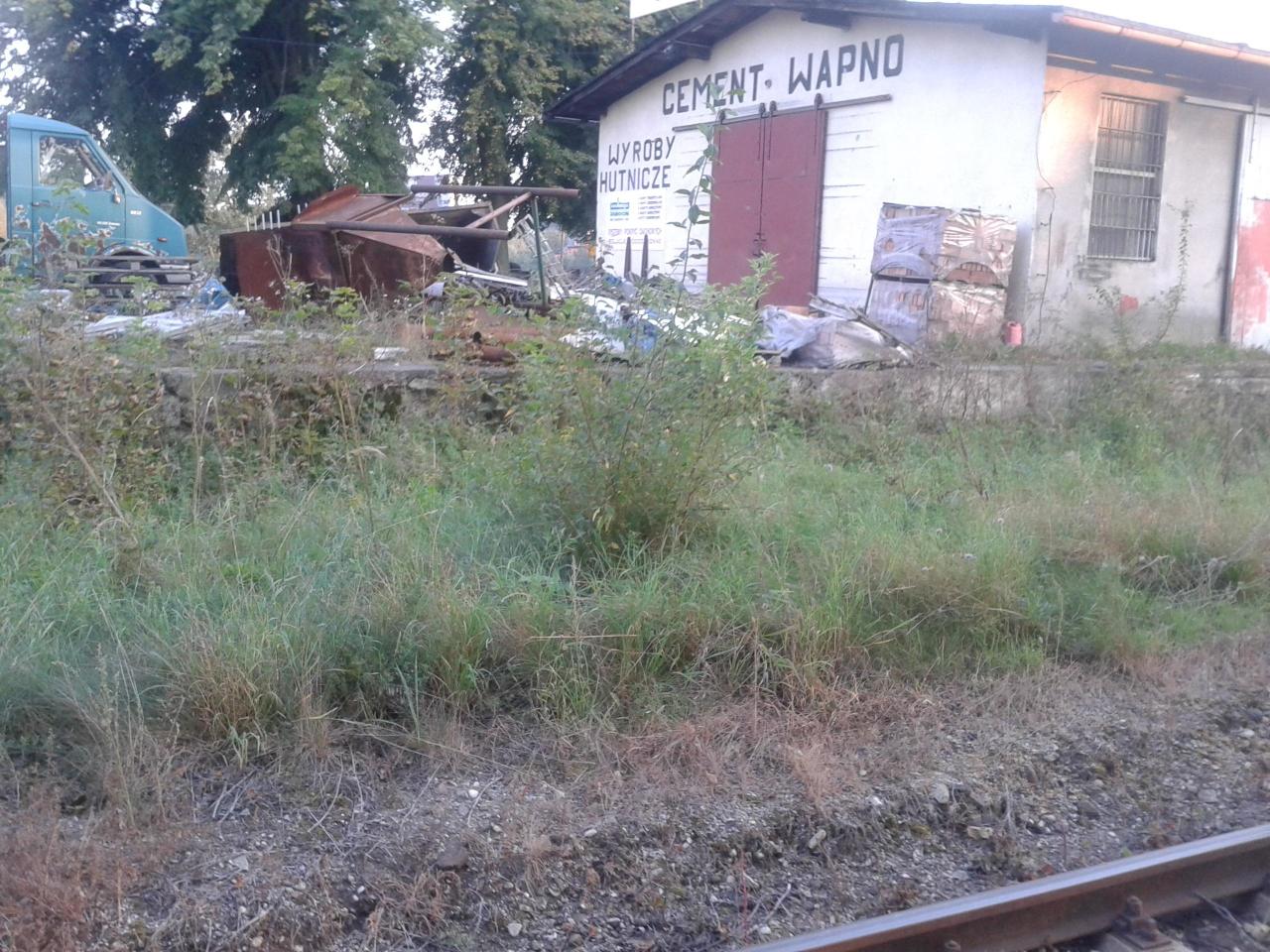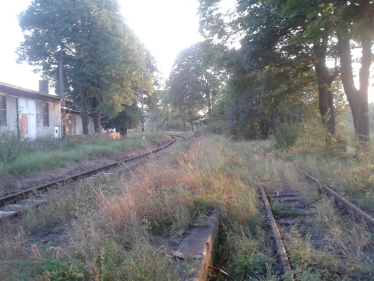 Peron 2 i zarośnięty całkowicie tor. Z lewej magazyn towarowy i budynek dworca. Widok w kierunku Glincza.