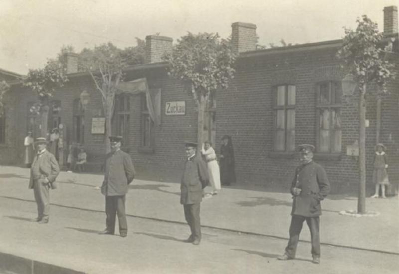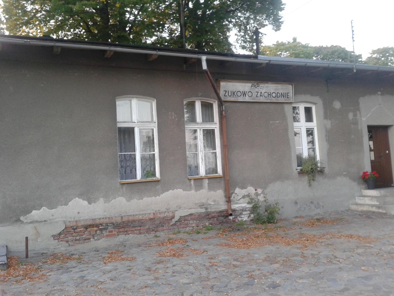 Żukowo Zachodnie. Budynek mieszkalny, w tle dworzec. Widok w kierunku Starej Piły/Pruszcza Gdańskiego.