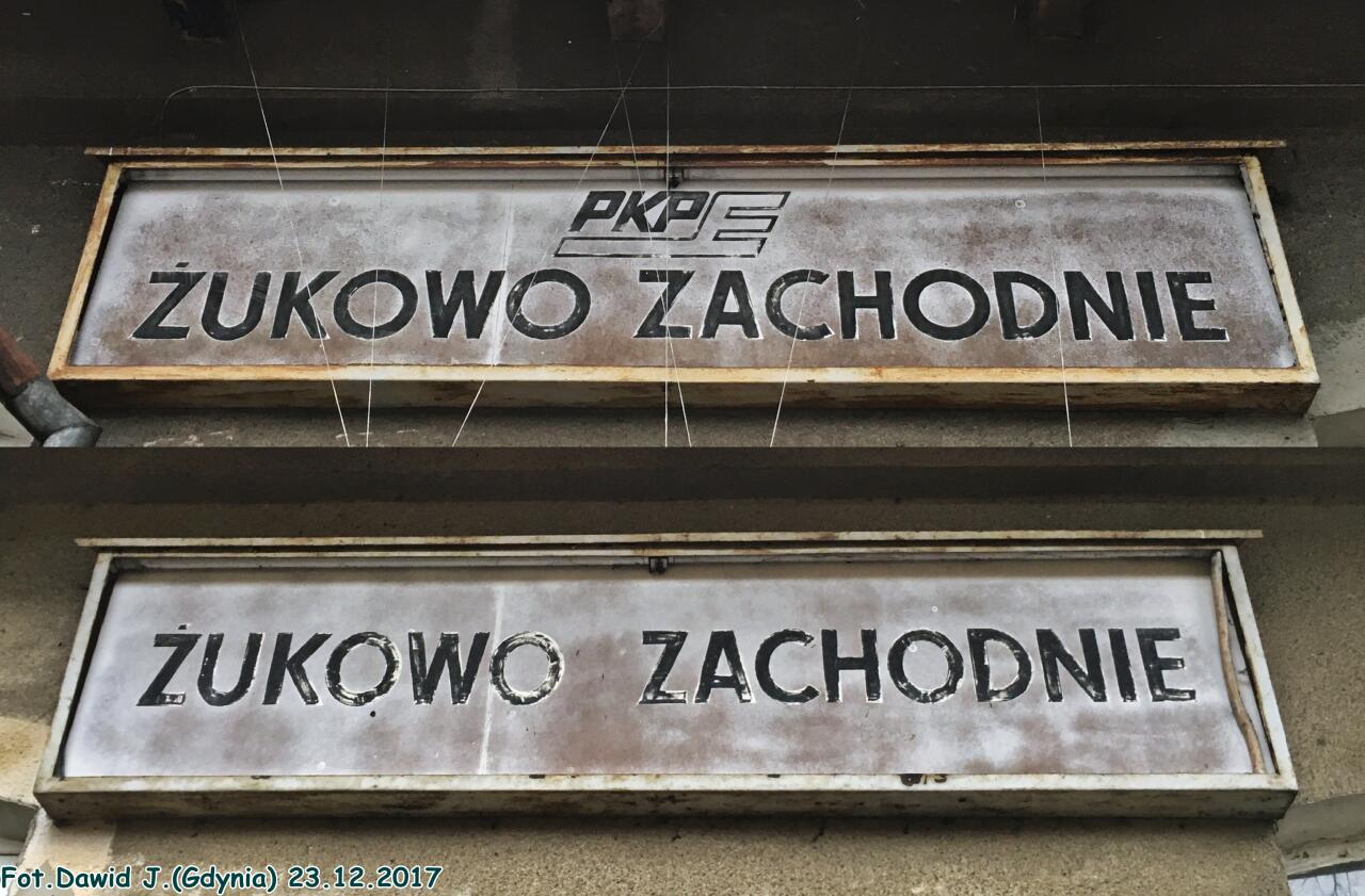 Tablice z nazwą stacji, sprzed kilkudziesięciu lat. Myślę, że stacja Żukowo Zachodnie nie sprawiała dużych problemów mieszkańcom gdy wsiadali lub wysiadali w tym miejscu. Do/z centrum Żukowa spokojnym krokiem chodnikiem idzie się około 8 minut.