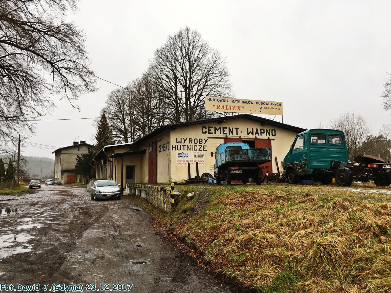 Kolejowy budynek mieszkalny (ul. Kościerska 16) i budynek dworcowy z przyległym budynkiem magazynu. Obiekty widoczne od strony podjazdu. Widok w kierunku Glincza/Kartuz.