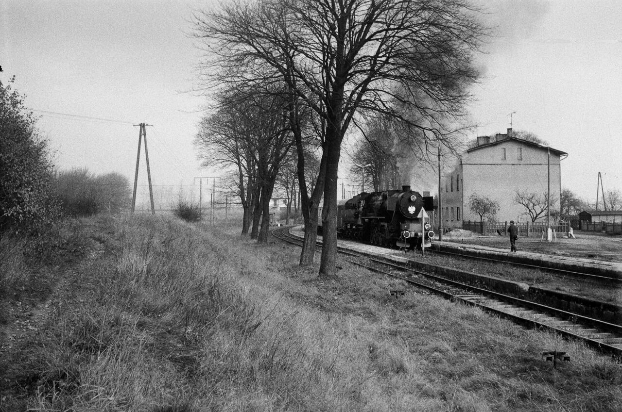Stacja Żukowo Zachodnie - perony, kolejowy budynek mieszkalny, pociąg specjalny "POCIĄG RETRO - OBCHODY ŚWIĘTA KOLEJARZA 1990" relacji Gdynia Główna Osobowa - Kartuzy, prowadzony parowozem Ty42-126 (MDp Kościerzyna). Widok w kierunku stacji Stara Piła (Pruszcz Gdański).