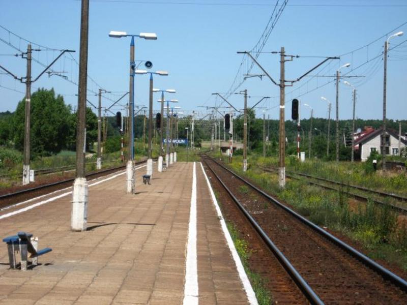 Widoczny splot torów ładunkowych przy budynku dworca. Widok w kierunku Pilawy.