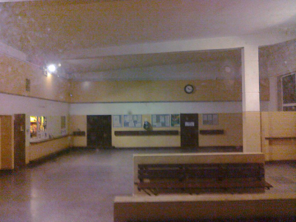Wnętrze Dworca. Wnętrze budynku dworca widoczne przez szybę. Budynek niestety jest zamknięty wieczorową porą.