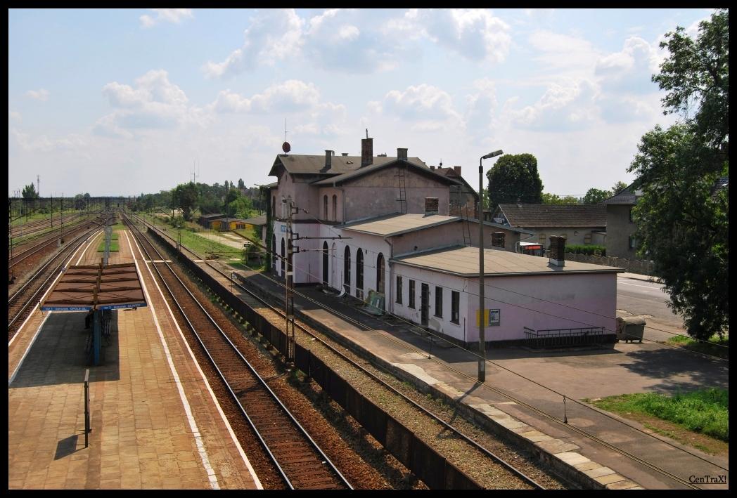 Widok na budynek dworca z kładki. Kierunek Gliwice.