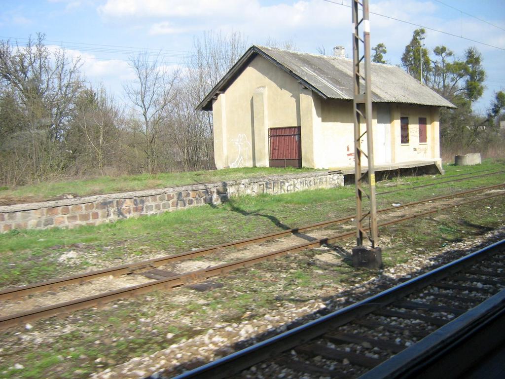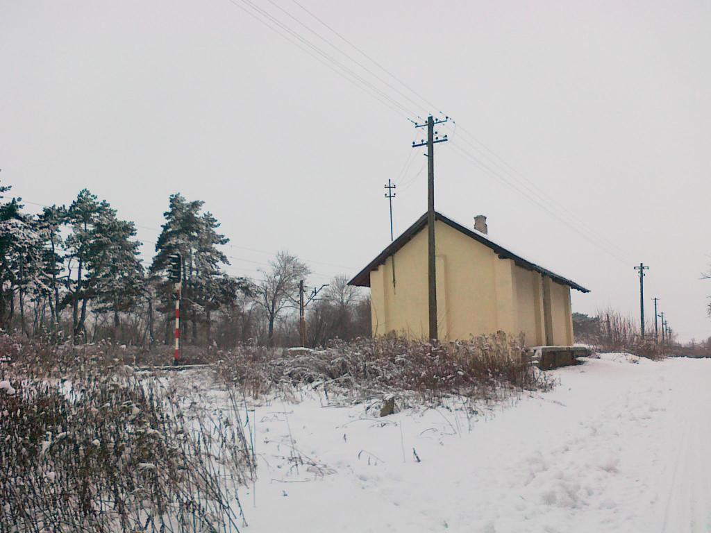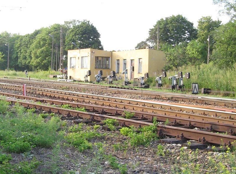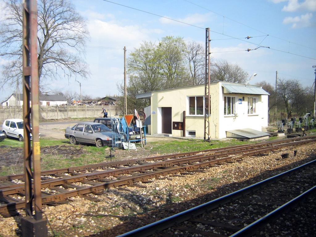 Nastawnia od strony Lublina. Zdjęcie przedstawia nastawnię parterową - widok z okna jadącego pociągu. Obok budynku widać naprężacze zewnętrzne. Naprężacz semaforowy sugeruje, że kiedyś na stacji znajdowały się semafory kształtowe. Teraz wszystkie naprężacze napinają linki do rozjazdów i ich rygli.