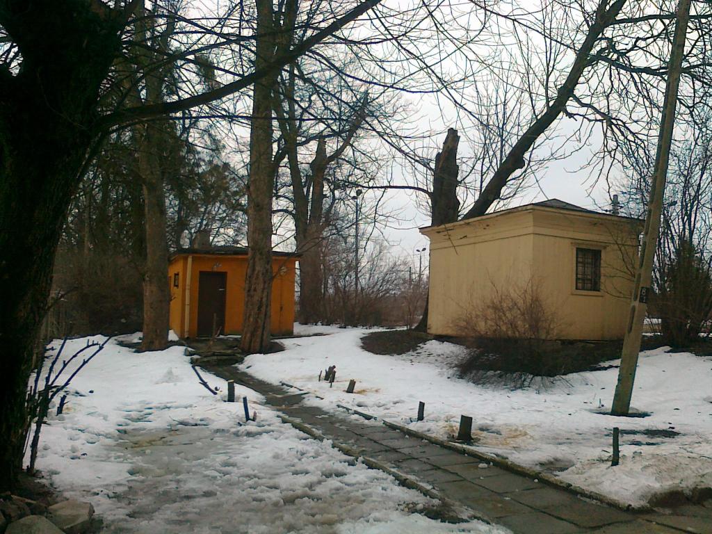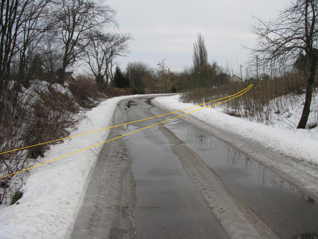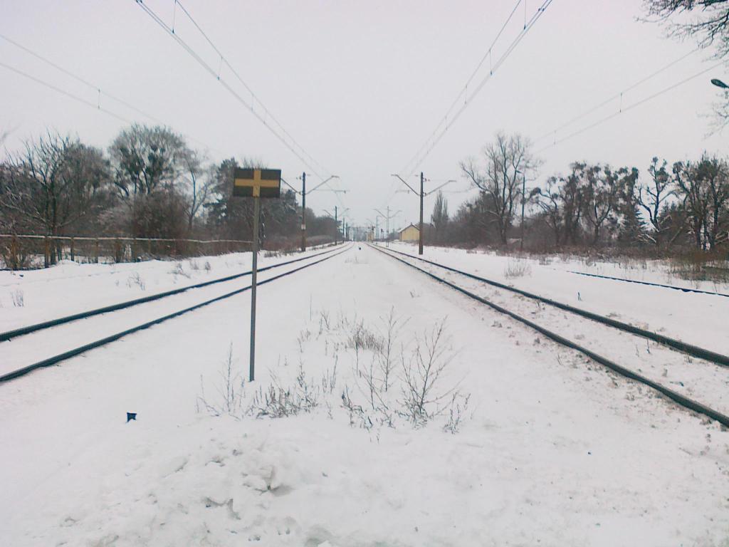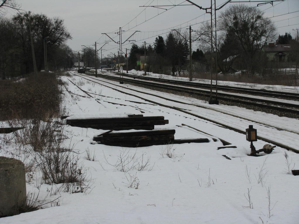 Zdjęcie przedstawia widok z drogi biegnącej wzdłuż toru w stronę dworca. Żółtymi liniami naszkicowałem istniejący w gruncie tor, który prowadził do podstacji trakcyjnej znajdującej się nieopodal nastawni od strony Dęblina. Tor w drodze został zaasfaltowany, za to w odchodzącej od widocznej na zdjęciu jezdni odnodze widać go dobrze (patrz inne fotki).