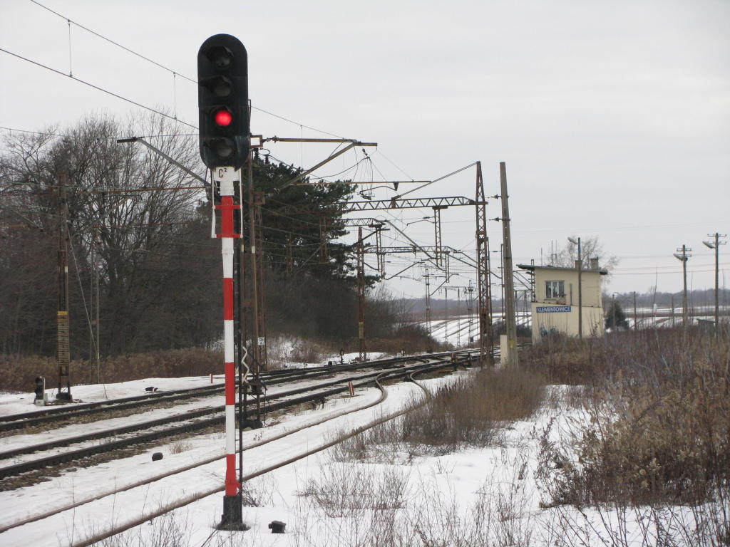 Widok w stronę Dęblina. Na pierwszym planie semafor wyjazdowy C2 stojący przy torze głównym dodatkowym nieopodal magazynu.